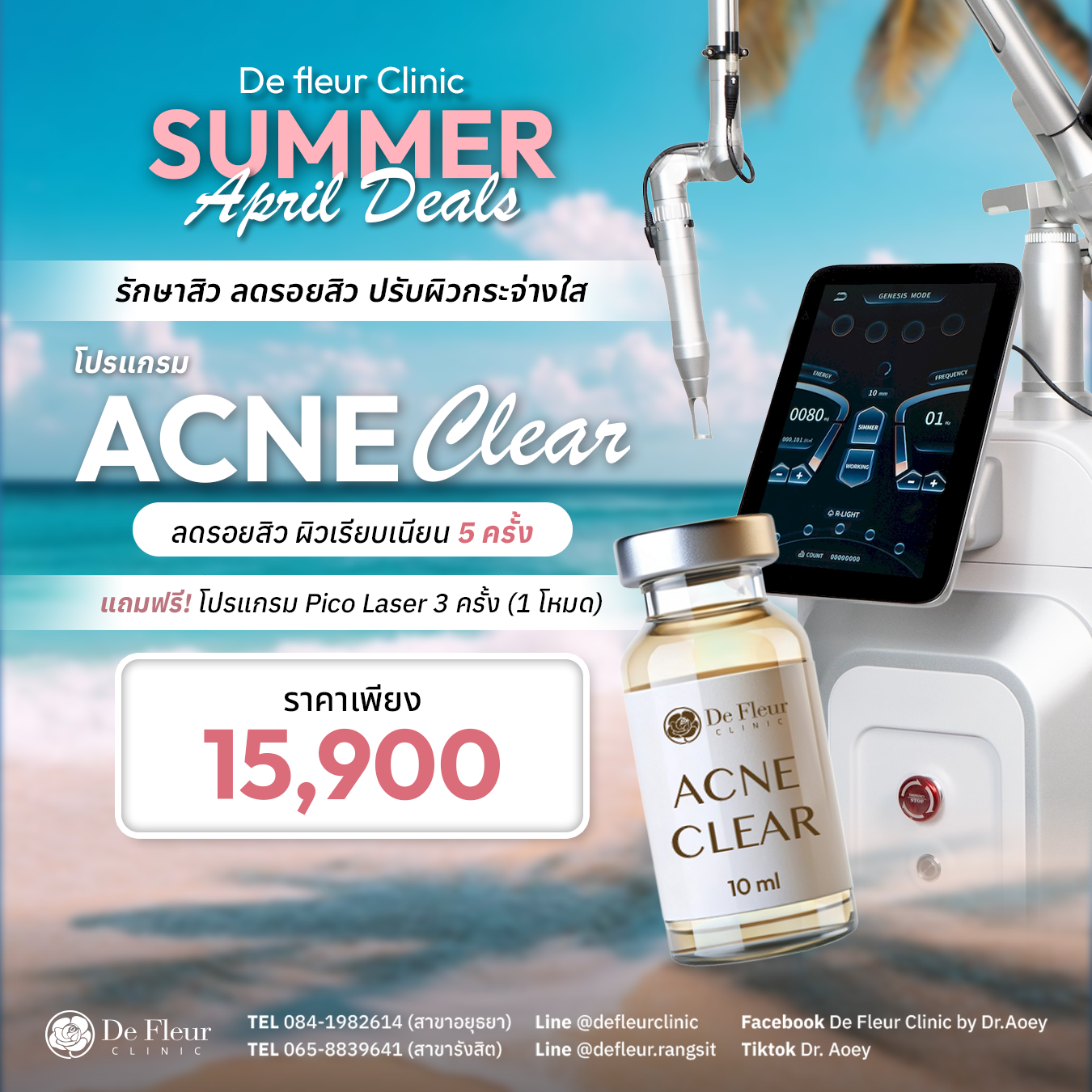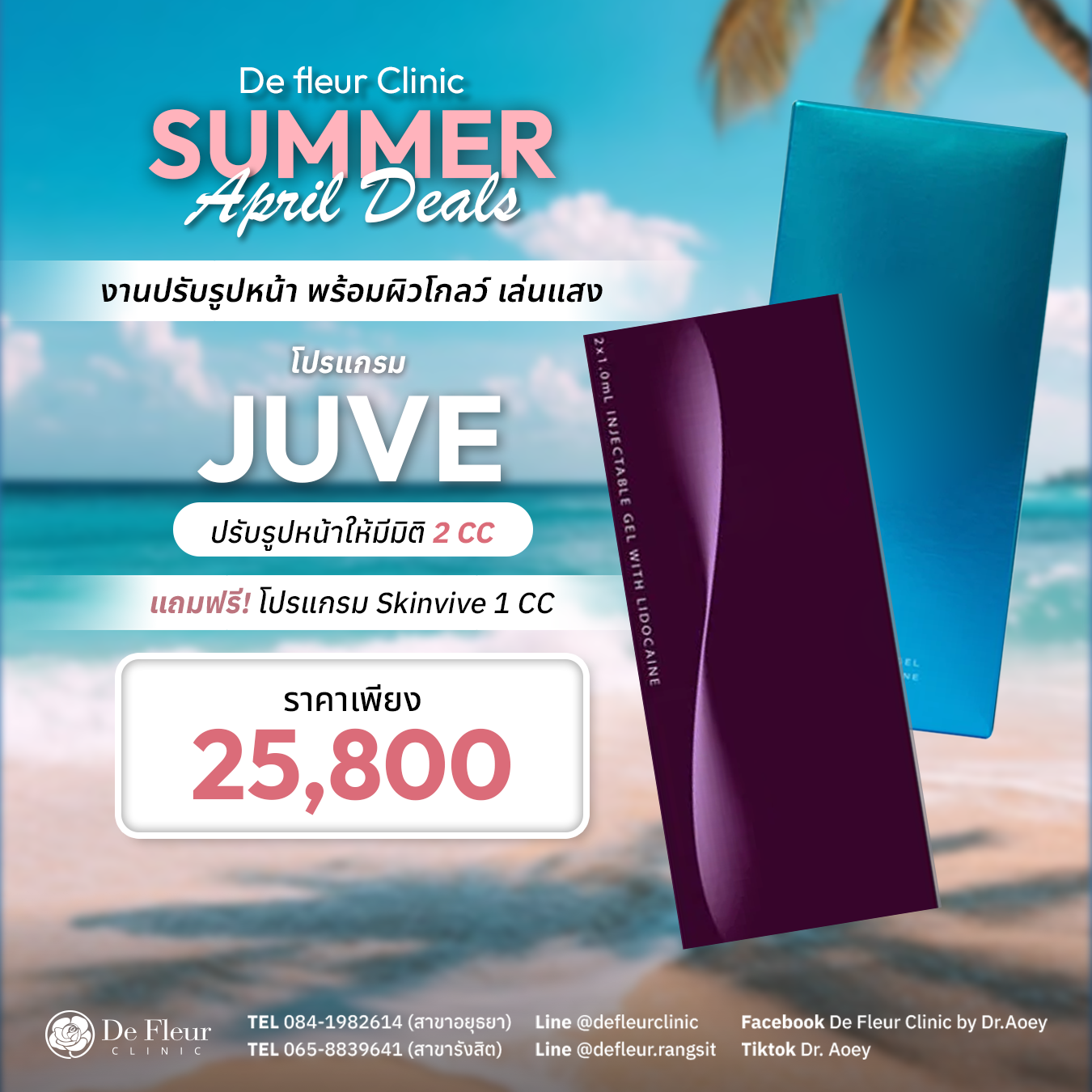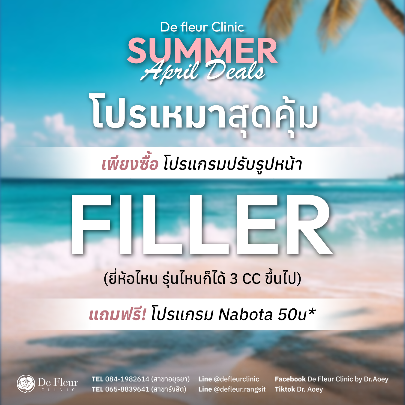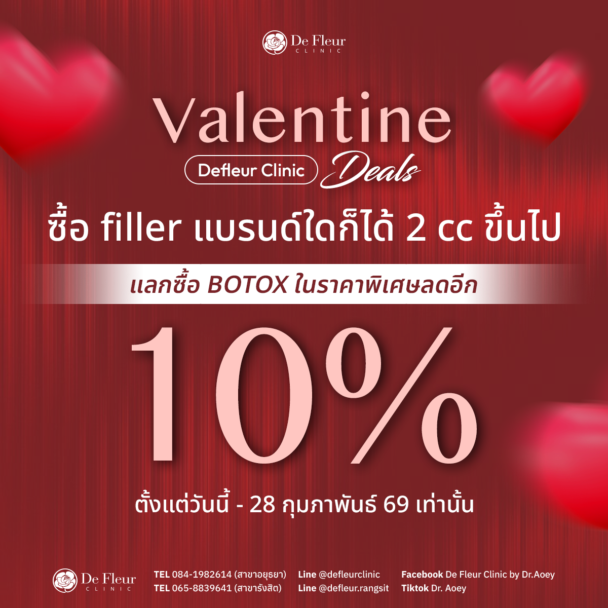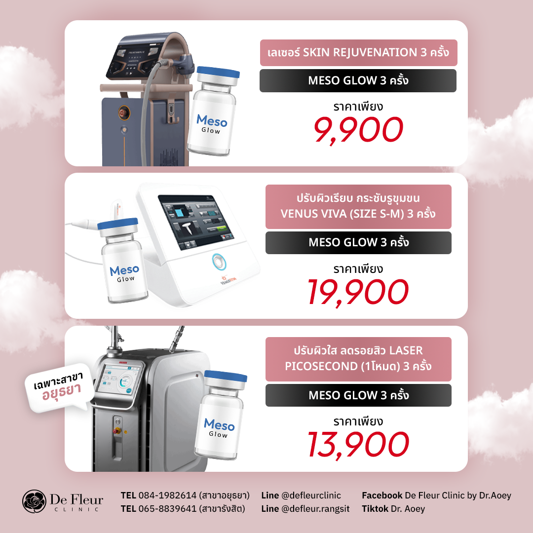 ยินดีต้อนรับสู่ De Fleur Clinic คลินิกเวชกรรมความงามที่ดูแลทุกปัญหาผิวและความงามอย่างมืออาชีพ โดยทีมแพทย์ผู้เชี่ยวชาญ ให้บริการด้วยเครื่องมือและผลิตภัณฑ์ที่ได้มาตรฐานสากล ปลอดภัยและเห็นผลจริง ปรึกษาฟรีไม่มีค่าใช้จ่าย เรามี 2 สาขา ได้แก่ คลินิกเสริมความงาม อยุธยา (โครงการนราวดีซิตี้พาร์ค) และ คลินิกความงาม รังสิต (ปั๊มน้ำมันบางจาก รังสิตคลองสอง) พร้อมบริการ คลินิกรักษาสิว อยุธยา, โปรแกรม รักษาสิว อยุธยา, ฟื้นฟูผิว บำรุงผิวพรรณ และเวชศาสตร์ชะลอวัย ให้คุณสวยมั่นใจในราคาที่จับต้องได้ เพื่อให้ ผู้รับบริการทุกท่านมีสุขภาพผิวที่อ่อนกว่าวัย สวยจากภายในสู่ภายนอก