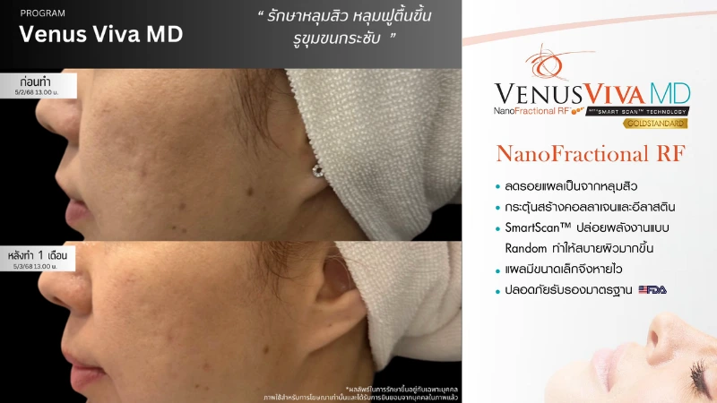 Venus Viva MD – เครื่องมือใหม่ล่าสุดที่คลินิกเสริมความงาม อยุธยามีไม่กี่ที่ ใช้เทคโนโลยี NanoFractional RF ซึ่งทำงานโดยส่งคลื่น RF ลงไปในผิวแบบจุดเล็กๆ (นาโน) เพื่อ