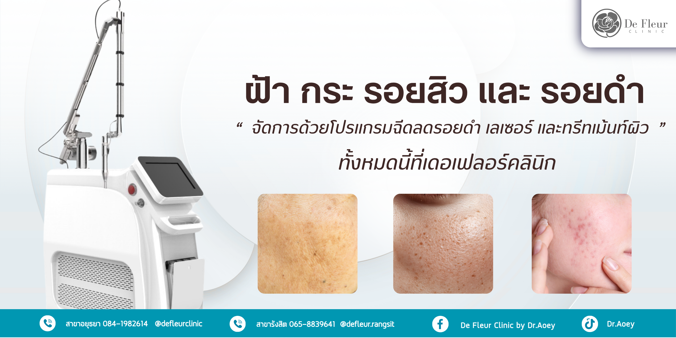 ที่ De Fleur Clinic เราเชื่อว่าการรักษาฝ้า กระ ไม่ใช่เพียงแค่การลบจุดด่างดำให้หายไปชั่วคราว แต่คือการ “ฟื้นฟูสมดุลของผิวจากภายใน” เพื่อให้ผลลัพธ์อยู่ได้นานและผิวกลับมาแข็งแรงจริงอย่างยั่งยืน
