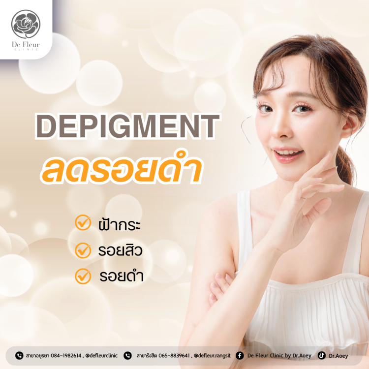 จุดเด่นของ Depigment: ลดเลือนรอยดำและฝ้าอย่างเห็นผล , ฟื้นฟูผิวให้ดูขาวใสเป็นธรรมชาติ , เหมาะกับทุกสภาพผิว โดยเฉพาะผิวแพ้ง่าย