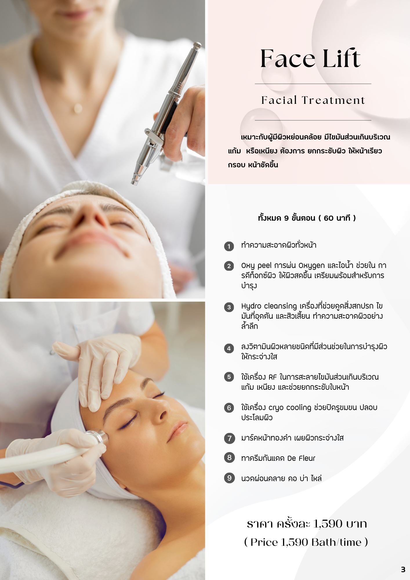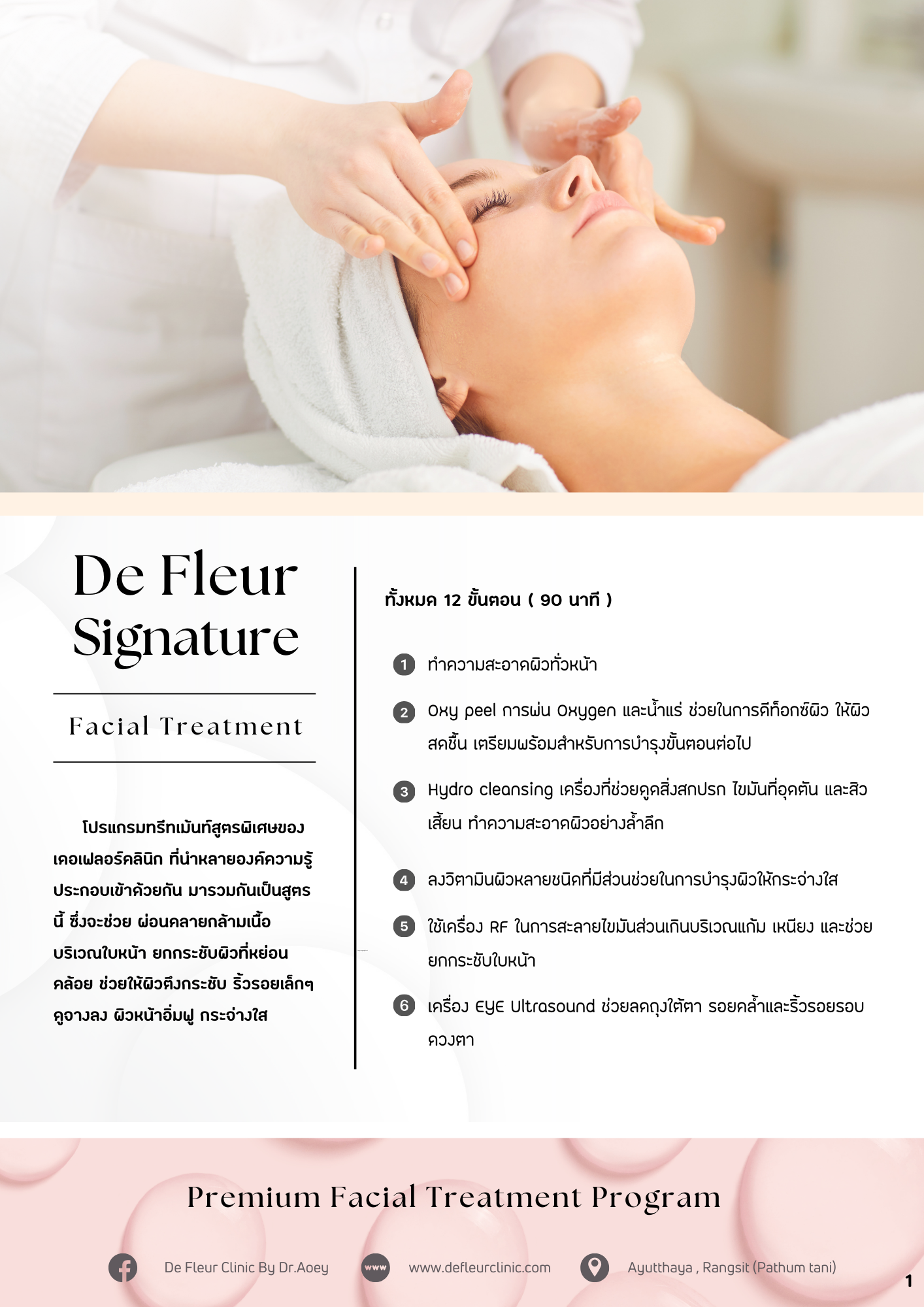โปรแกรมทรีทเมนต์ นวดหน้า ขัดหน้าใส สูตรพิเศษของ De Fleur Clinic ที่รวมศาสตร์การดูแลผิวและเทคโนโลยีความงามไว้ด้วยกัน ช่วยผ่อนคลายกล้ามเนื้อใบหน้า ยกกระชับผิว ลดริ้วรอย พร้อมเผยผิวกระจ่างใสอย่างเห็นผล